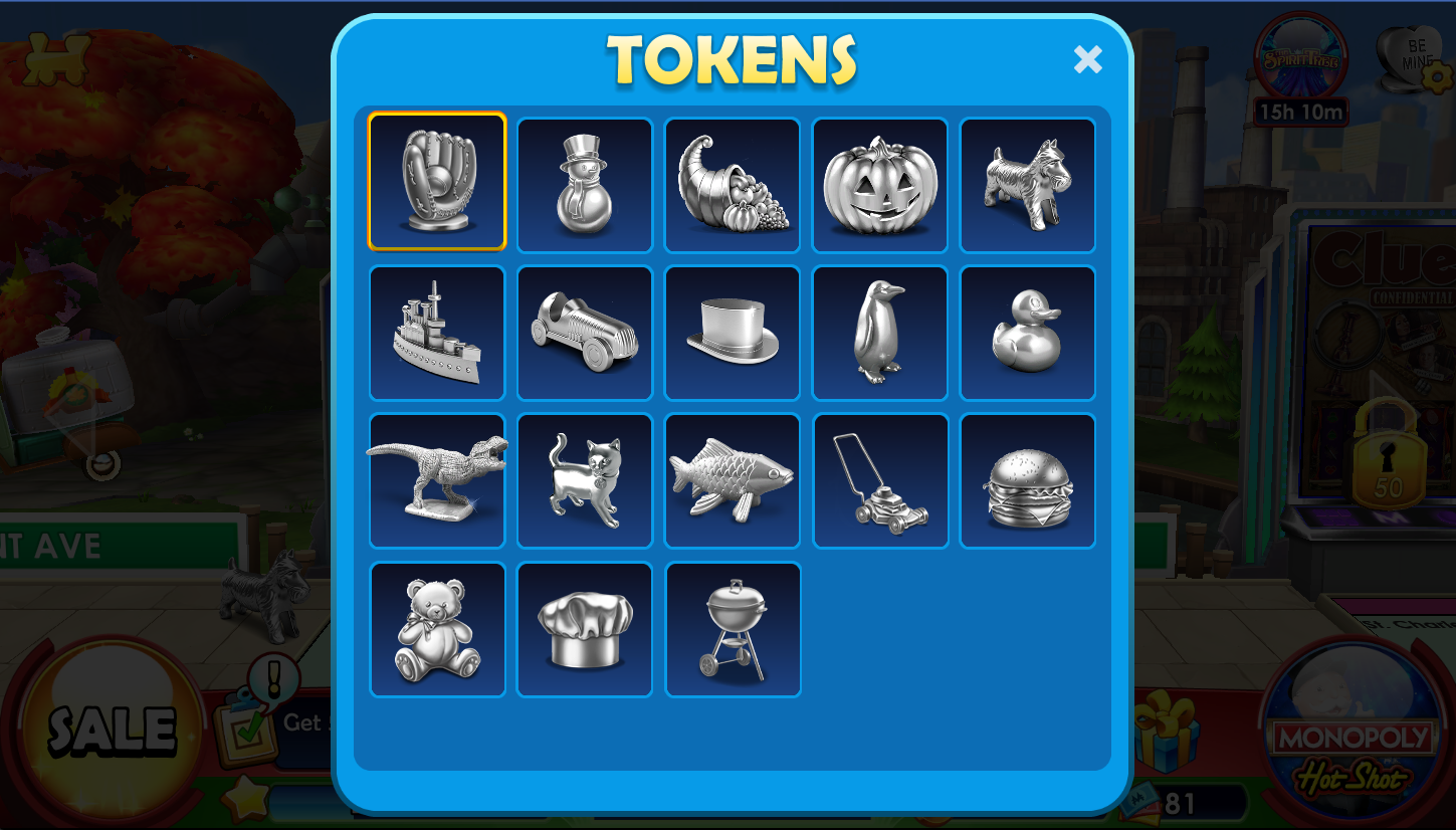 Token selection menu featuring player’s earned tokens