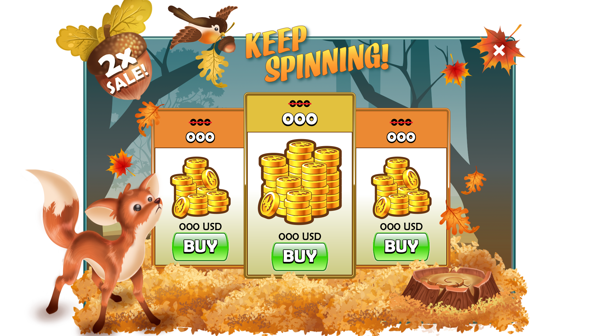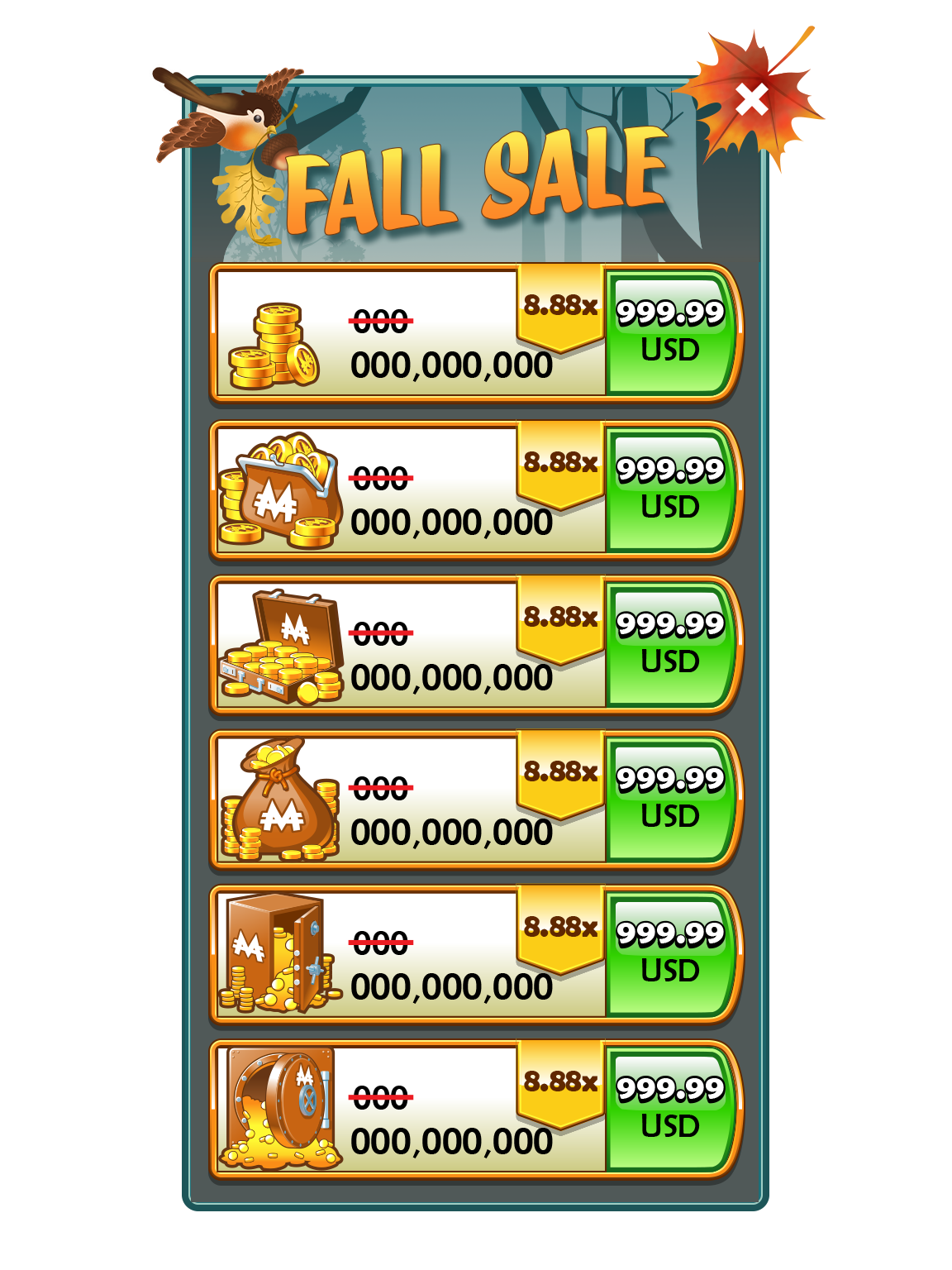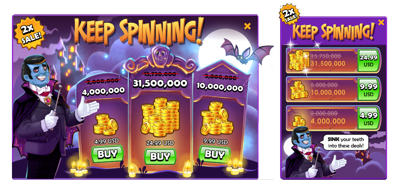 There are multiple store items, or coin packages, that can be shown, as well as different prices and coin values based on user purchase history and themed event sales. The standard store has 6 items, although this is modifiable. When a player exhausts their coin supply the Out of Coins store, or OOC store, is toggled as a prompt to buy more coins to continue play. The OOC store consists of 3 items. The standard store and OOC store appear in both landscape and portrait orientations for compatibility across devices.