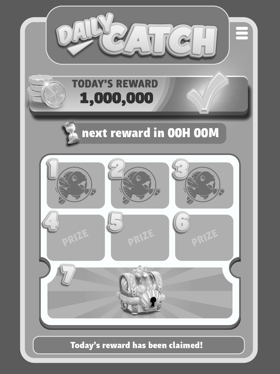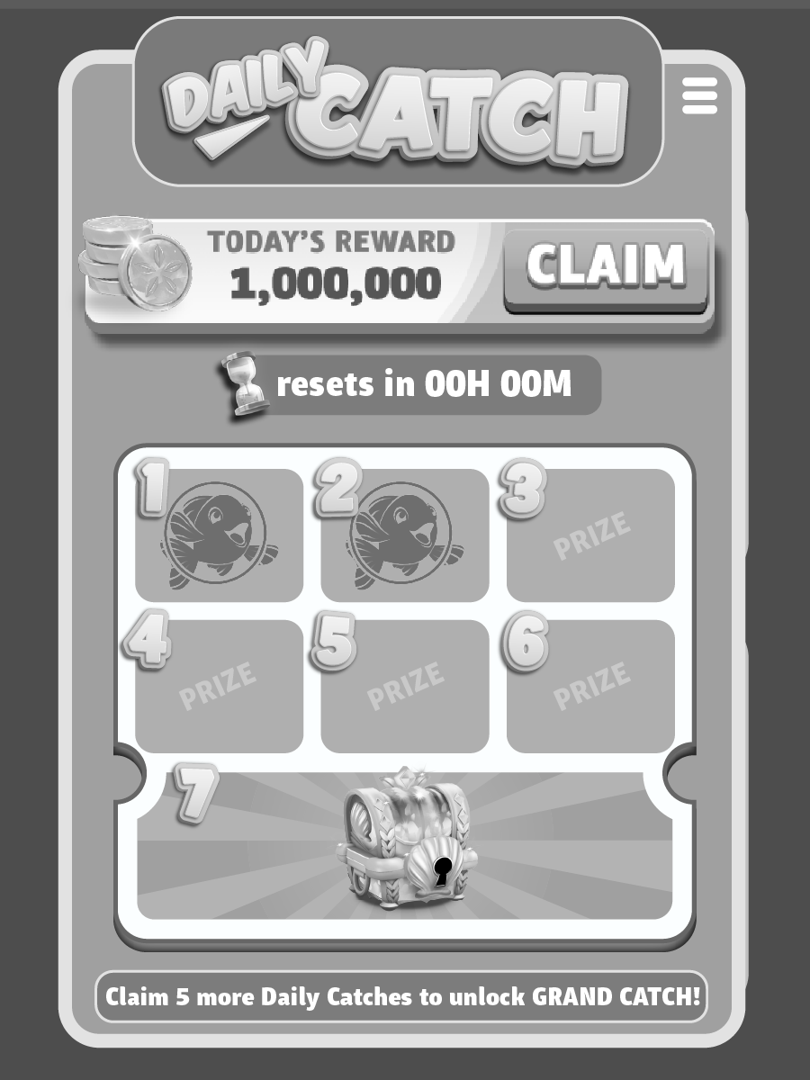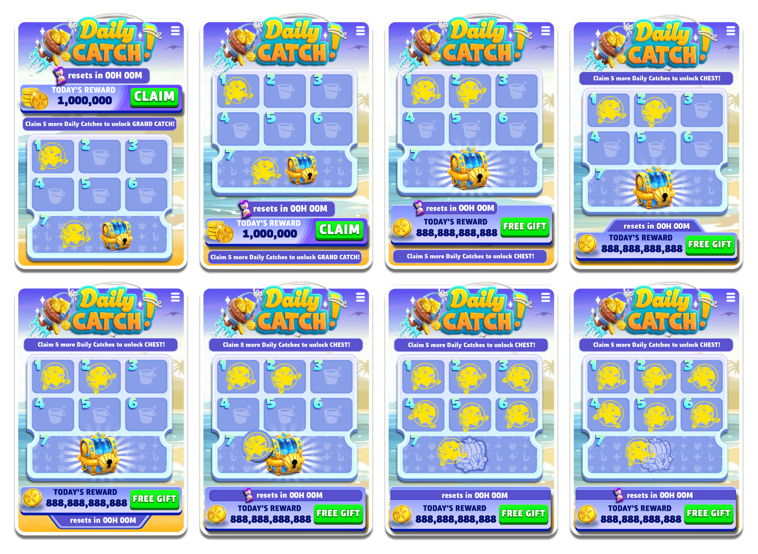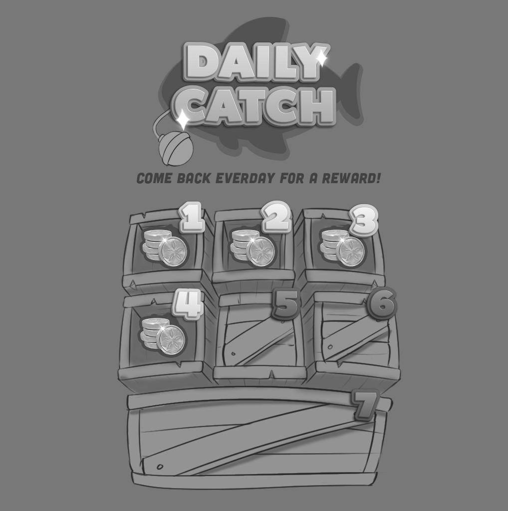 DAILY CATCH is a habit-forming daily login system that rewards players with currency, items, and boosts; packaged as a satisfying, stamp-able punch card.