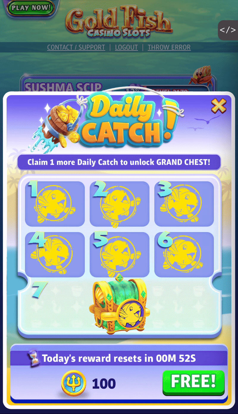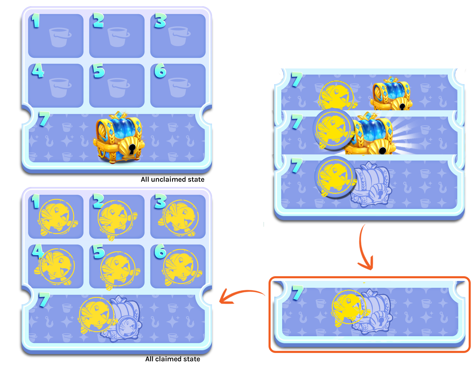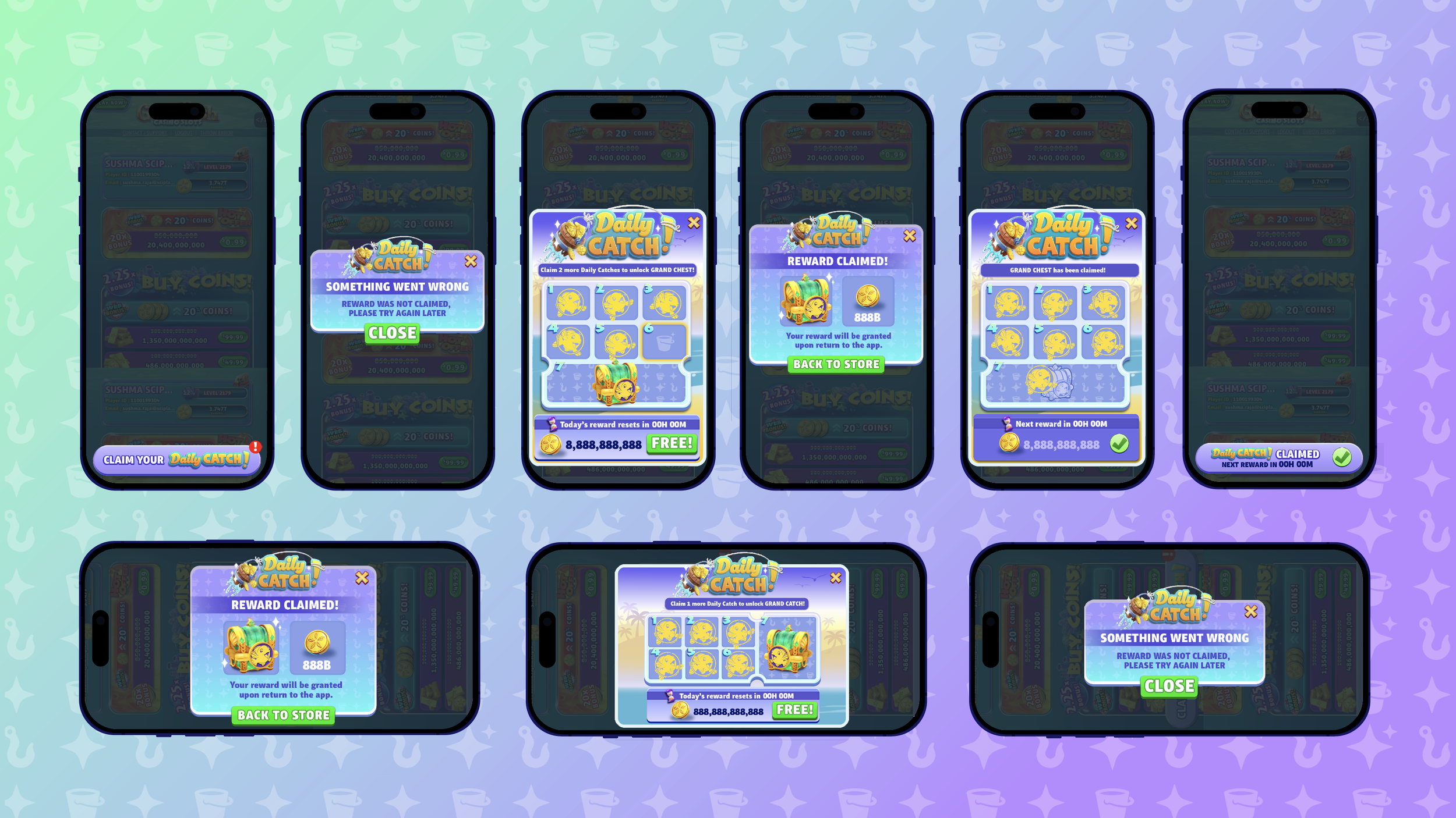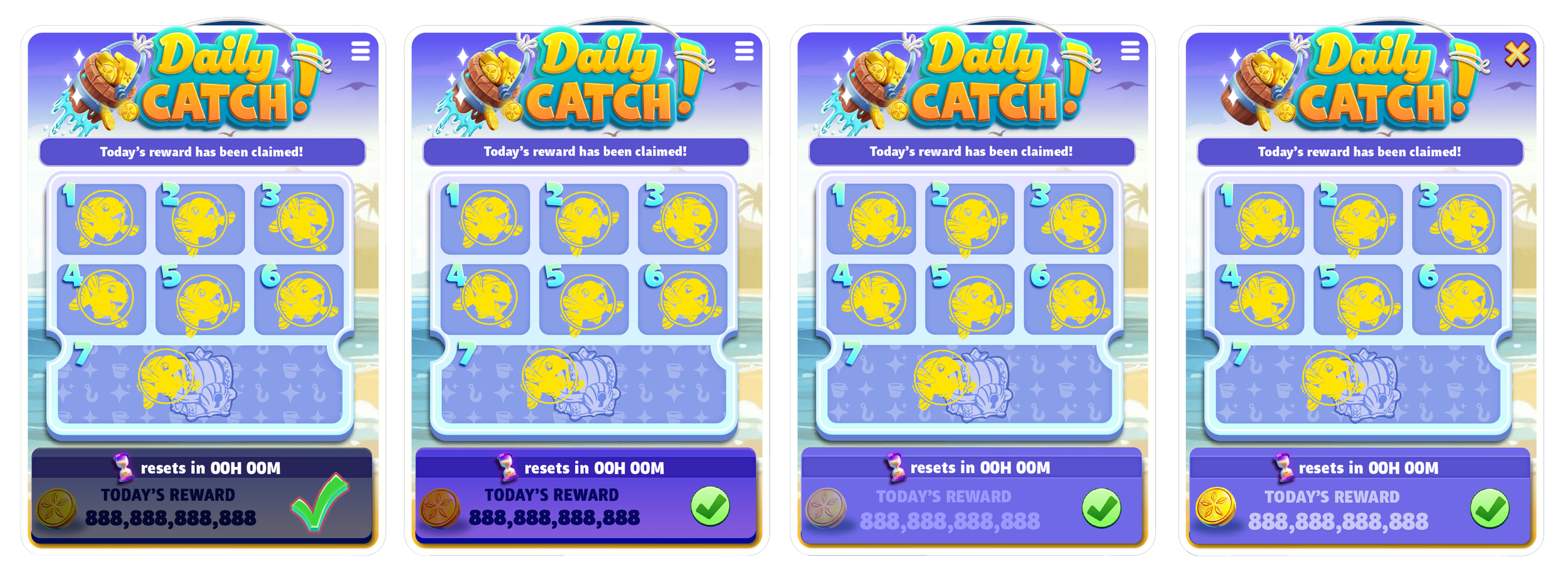 DAILY CATCH is a habit-forming daily login system that rewards players with currency, items, and boosts; packaged as a satisfying, stamp-able punch card.