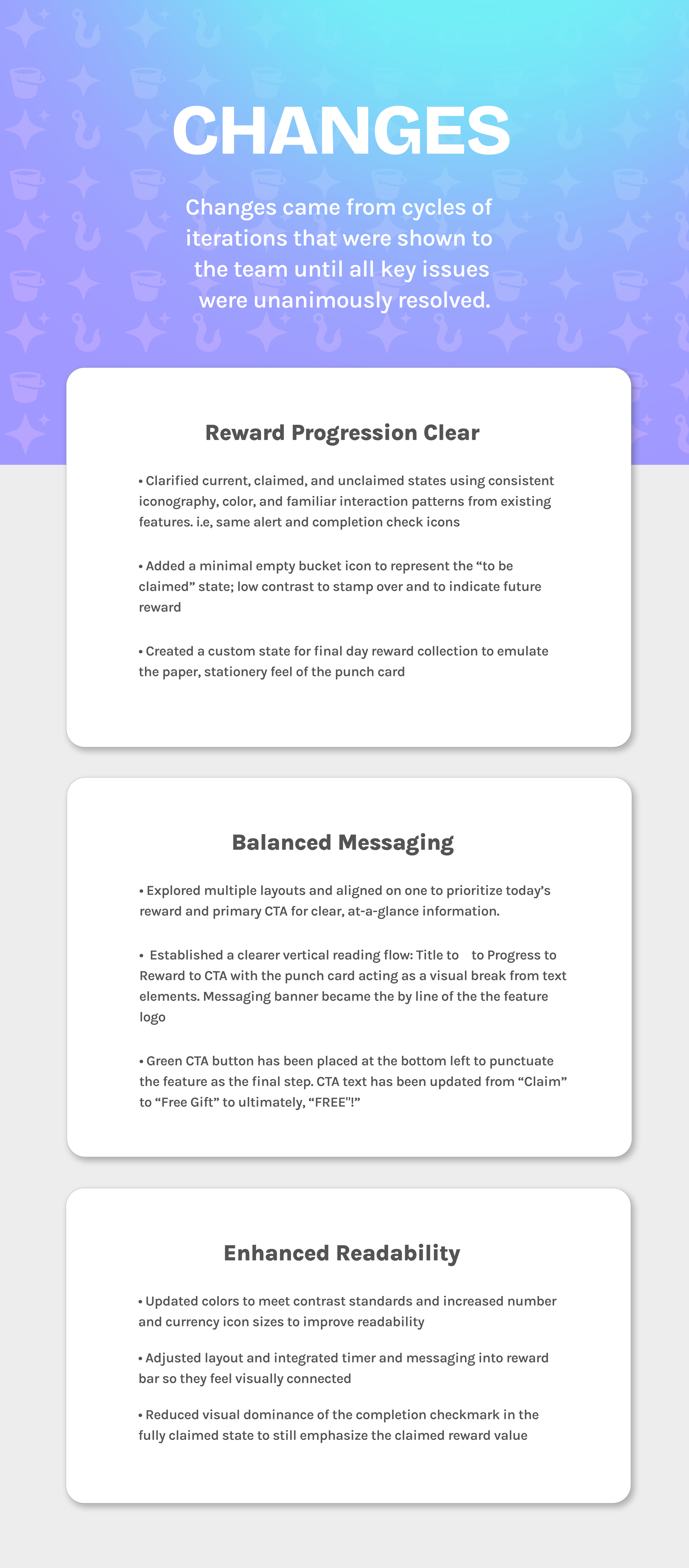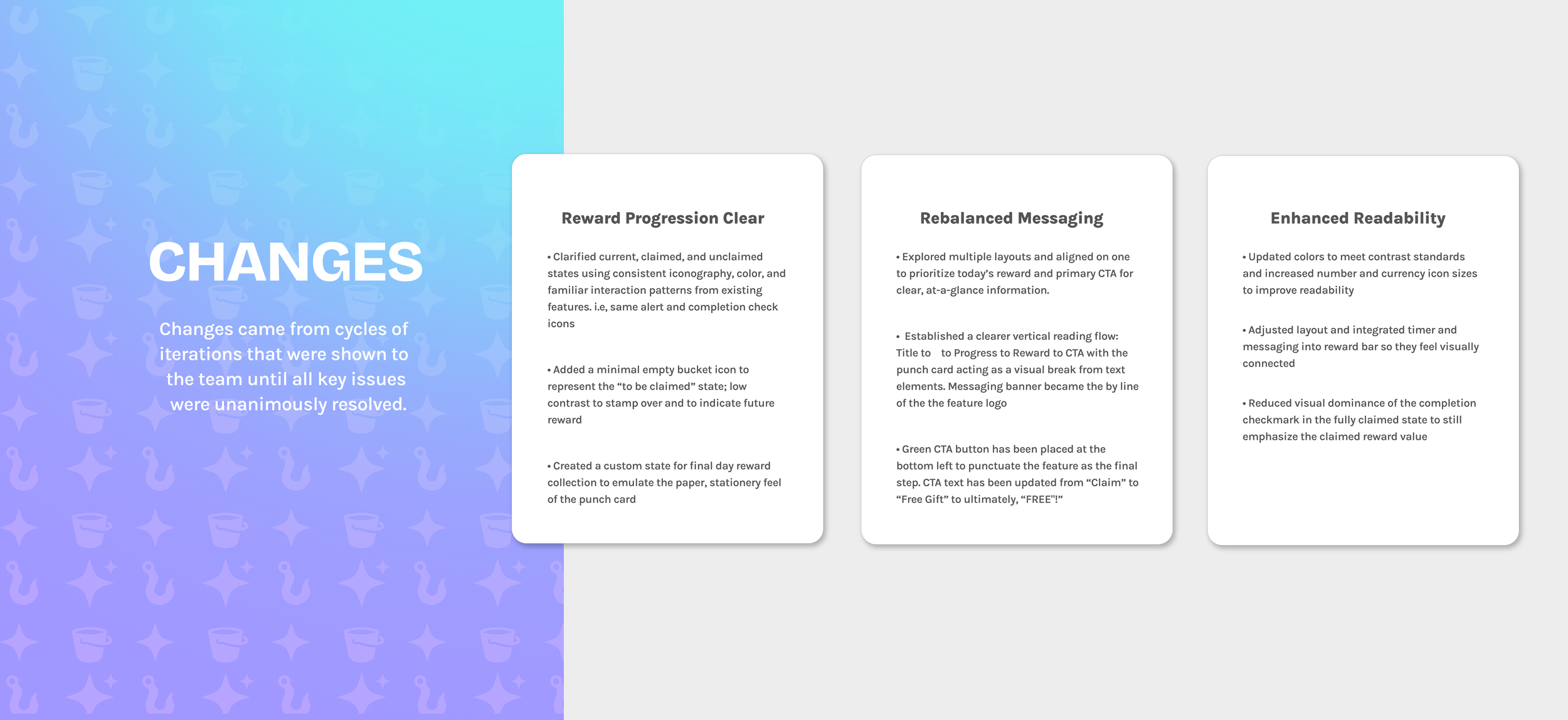 Low-fidelity wireframes to explore flow, noting crucial touch points, and optimizing for portrait mode. The design uses a bottom-drawer interaction modeled after an existing, well-understood pattern found in other parts of the Goldfish ecosystem. Space has been allocated for a countdown timer and accompanying body copy to clearly communicate when the next reward is available.