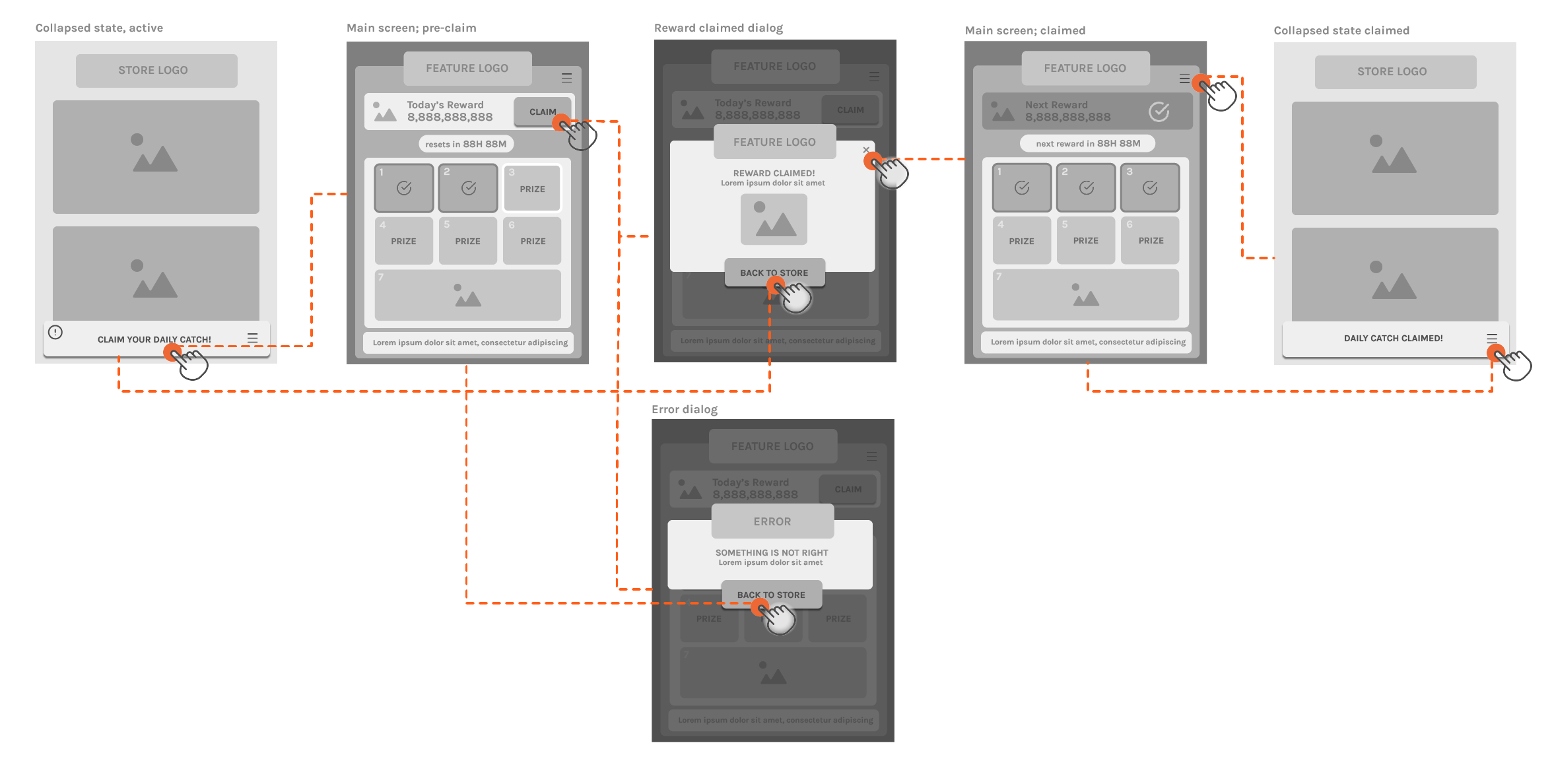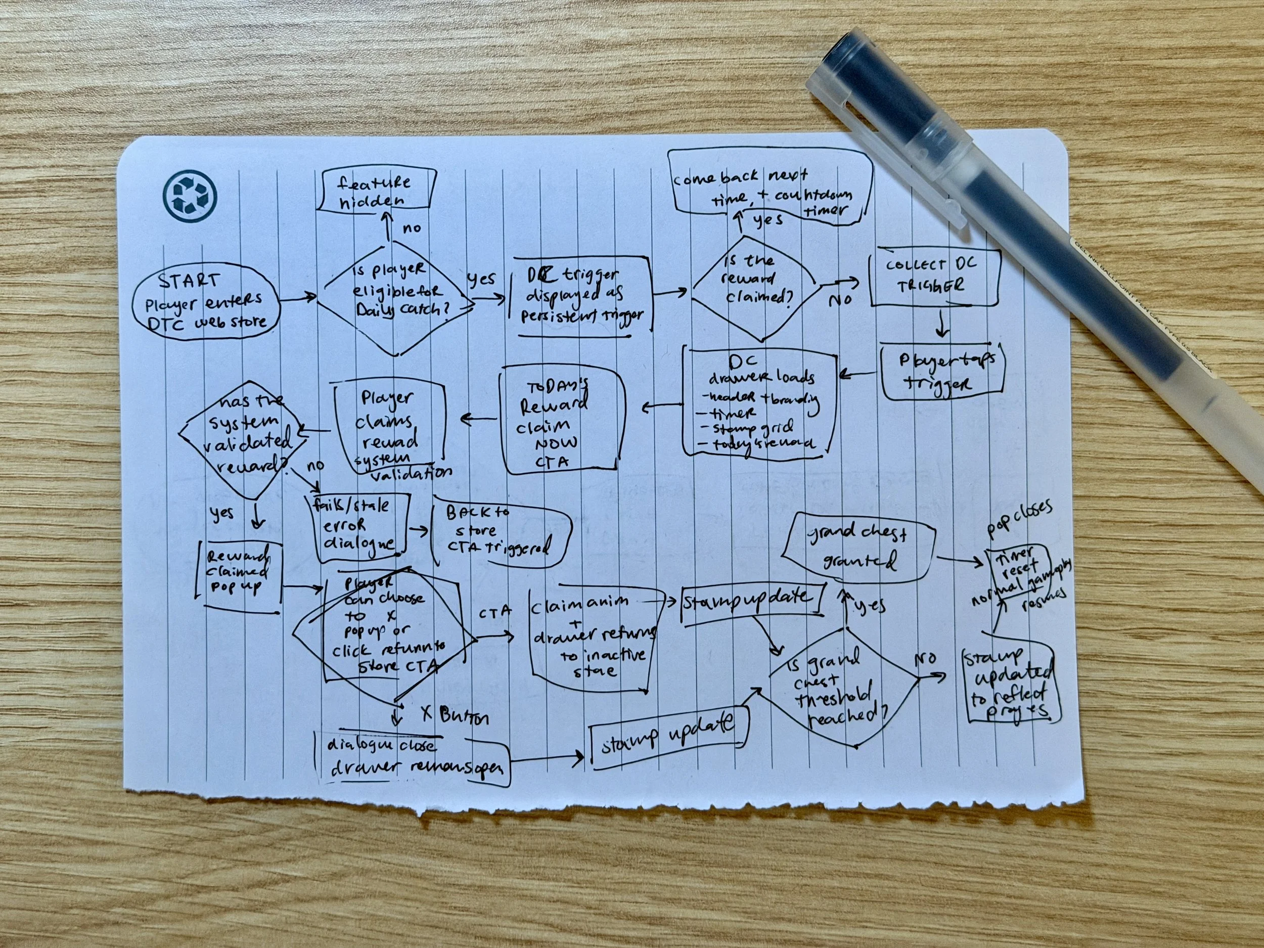 To kick off the design process, I drew a detailed user flow that outlined how players could interact with the Daily Catch feature across various states per the product spec. This ensured I captured all necessary key moments and screens before moving into wireframing. It also allowed me to preemptively notice points that could become moments of delight. I then cross-checked the flow against the engineering team’s flow diagram from their technical design document to align on the exact interactions I would be designing towards.