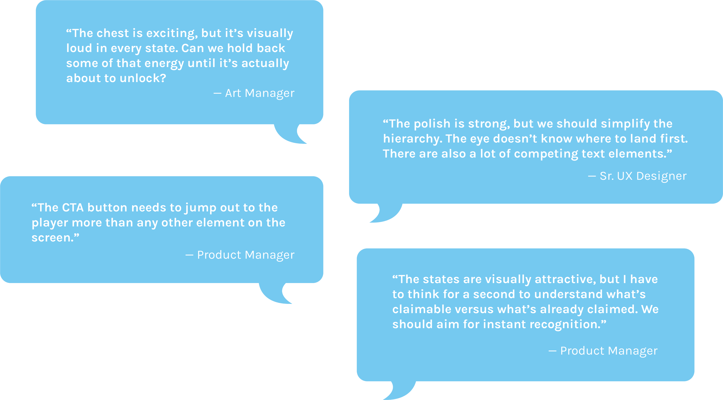 Feedback from weekly design reviews and team playtests highlighted several areas where the user experience could be sharpened