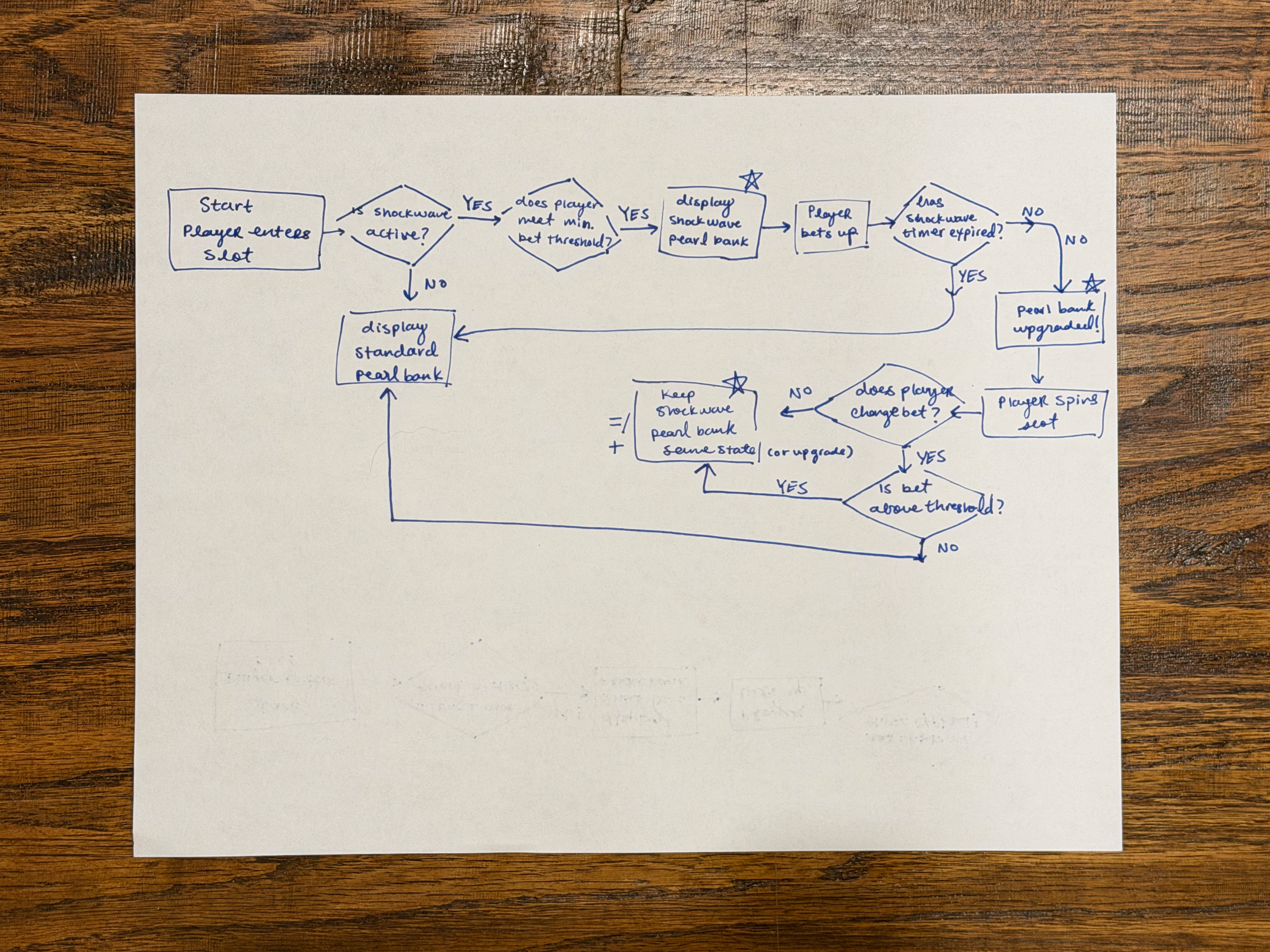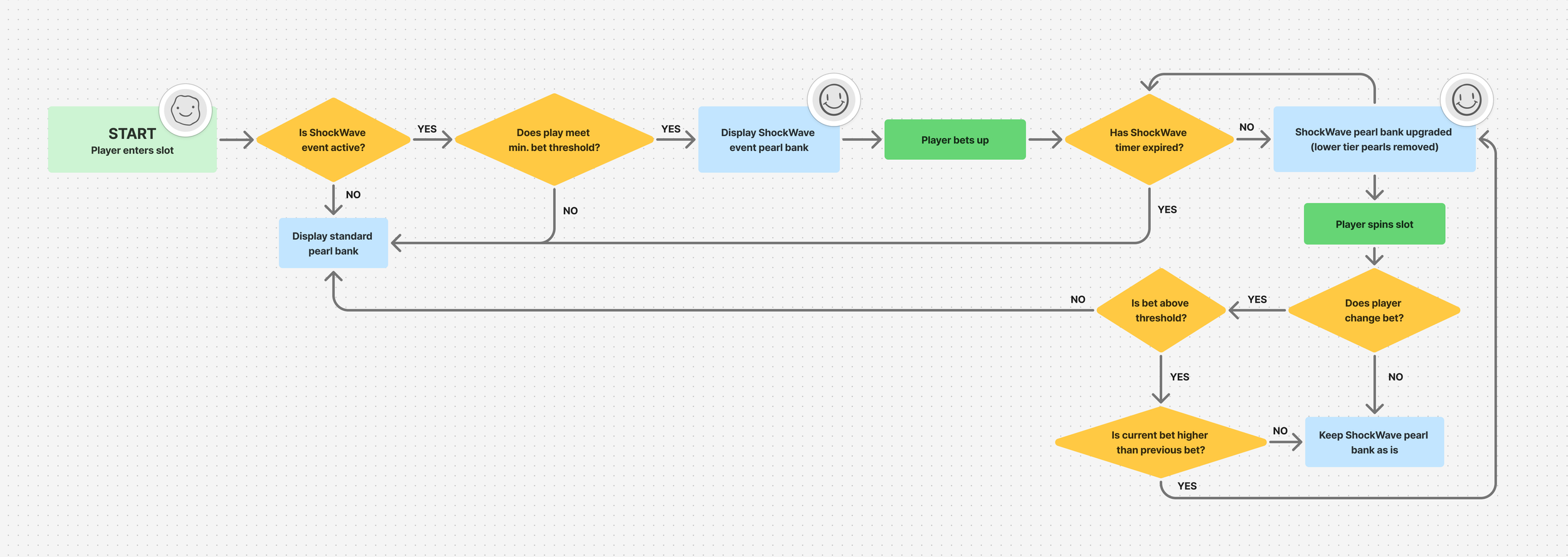To kick off the ShockWave design process, I mapped a user flow outlining how players enter, qualify for, and progress through the event across bet states based on the feature spec. I reviewed the flow with the product owner and engineering team to ensure alignment with technical requirements before moving into wireframing. This process ensured all key moments were captured early and surfaced opportunities to introduce narrative beats within the mini-game experience. I designed the flow with three goals in mind: