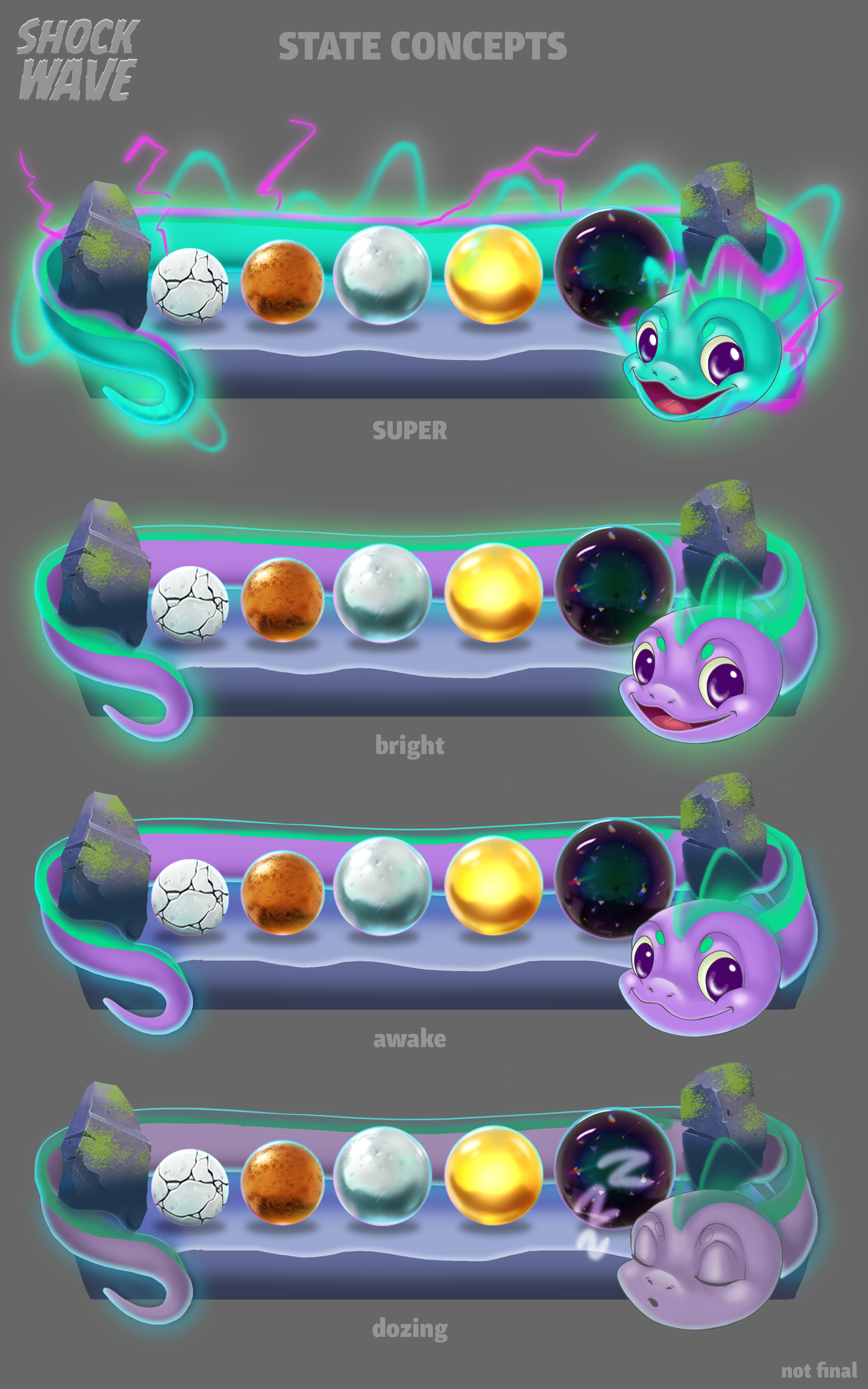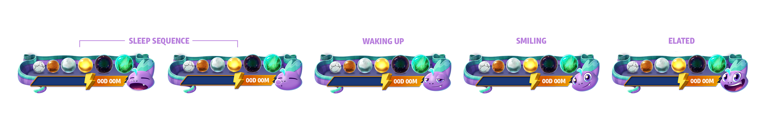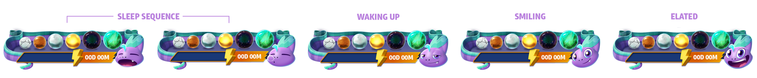 • Simplified emotional range and facial expressions across key states (sleeping, waking up, charging, activated) to create anticipation as players bet up
