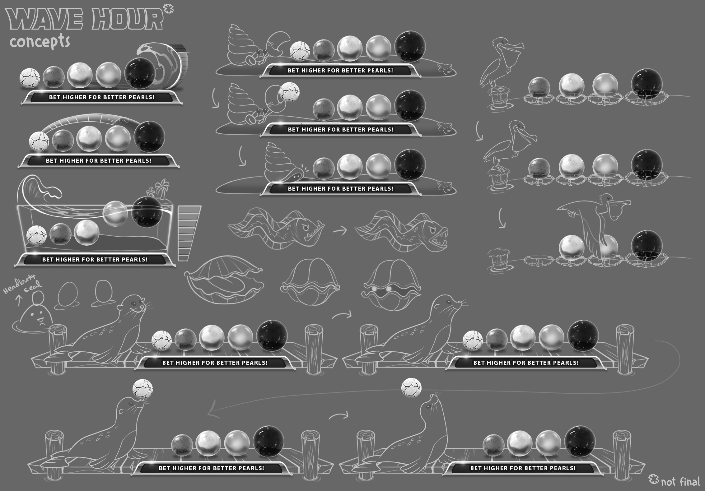 Concepts spanned from pelicans mischievously scooping up pearls and seals playfully headbutting them, while hermit crabs pilfered them into their capacious shells, to more abstract wave-based graphical meter representations.