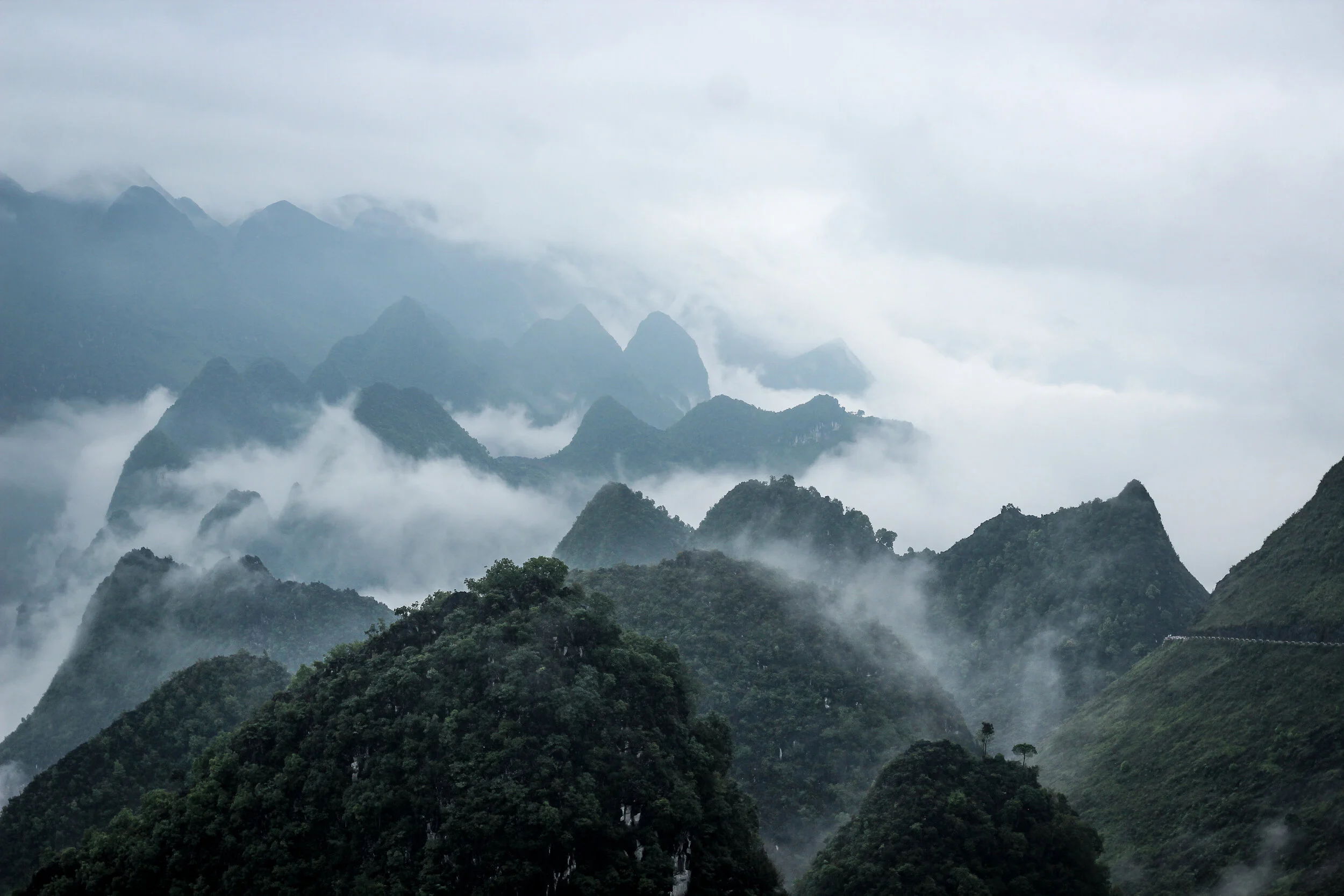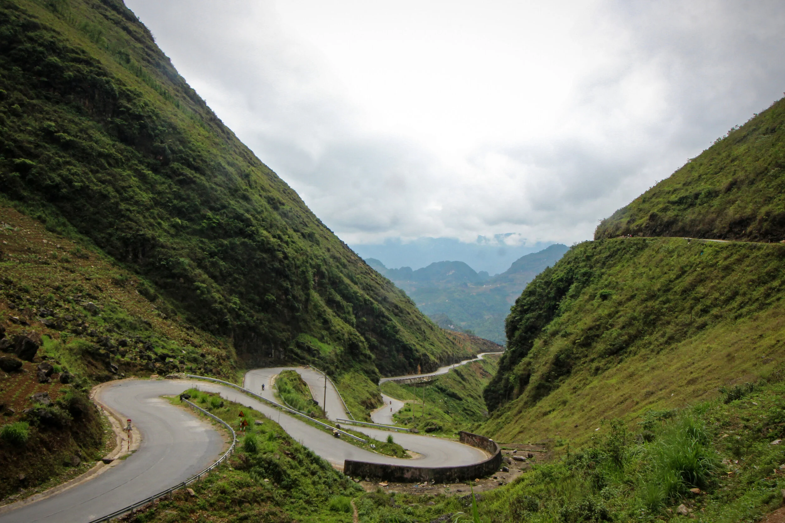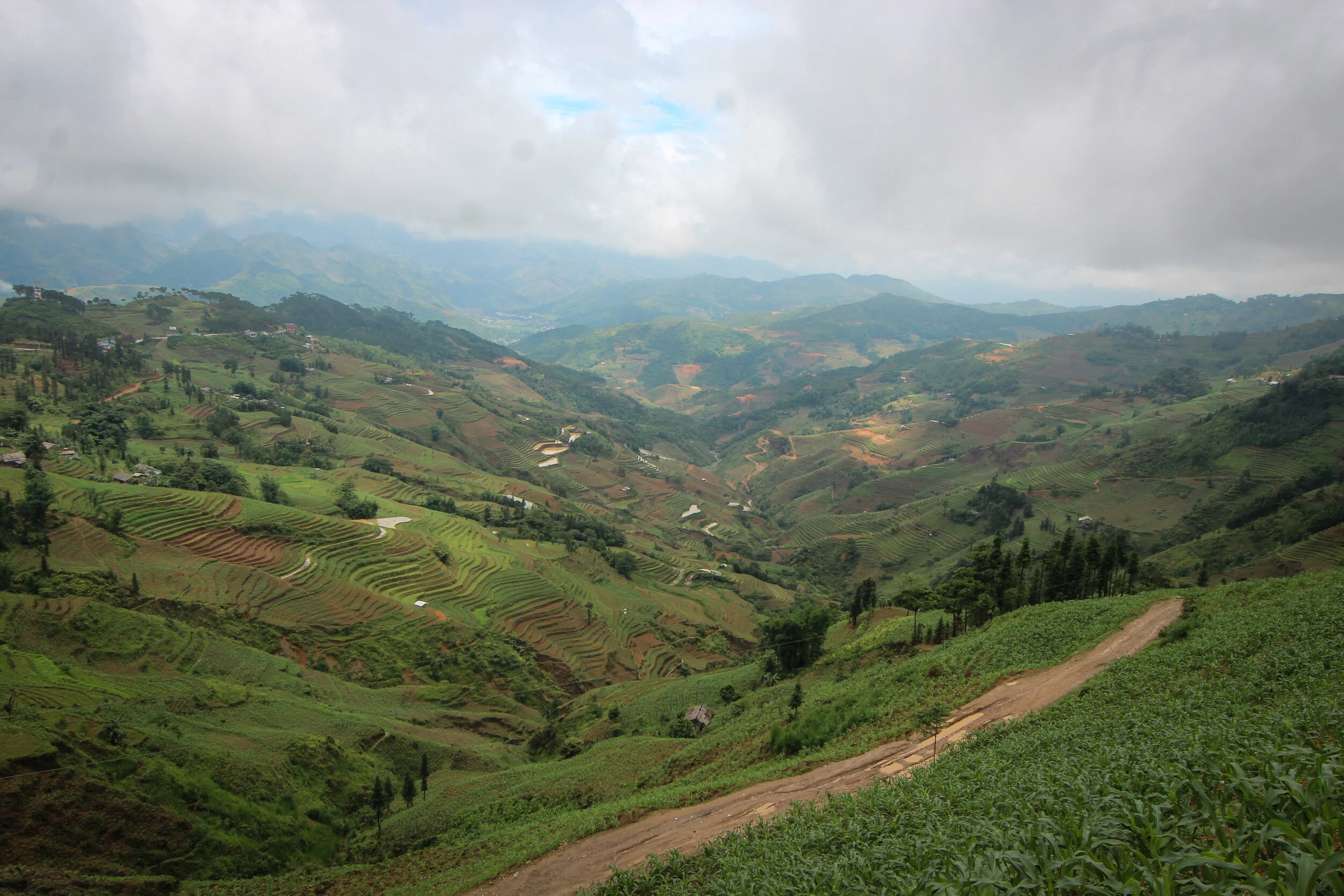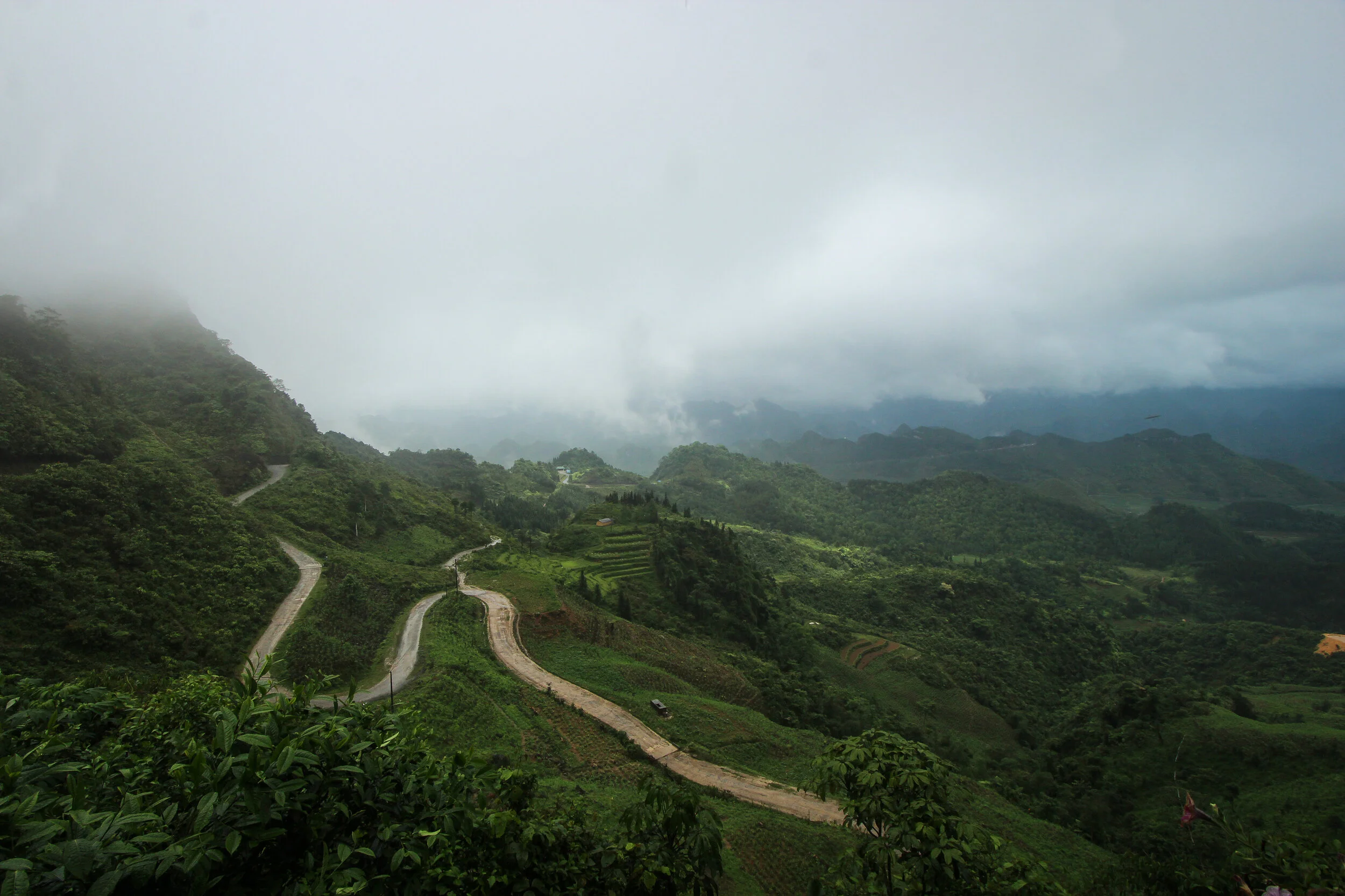 The landscape in Ha Giang is overwhelmingly beautiful. Limestone ridged mountains rise up in pyramidal shapes before sinking to hundred-foot mounds and then climbing once more to 5,000-foot peaks. Rice terraces slice along precariously steep mountainsides, hanging over blue snaking rivers, beneath blood-curdling bends. Colorful farmland climbs to rocky, edged cliffs before rolling off to distant pine forests.